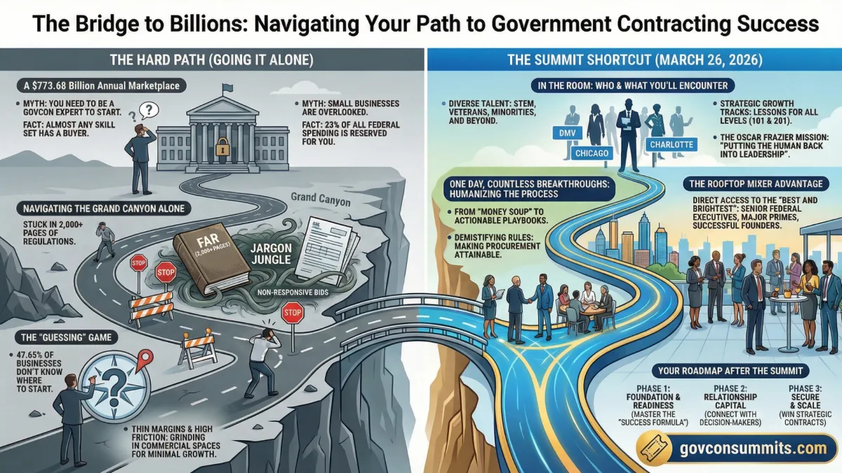 Learn the steps to advance or get started in federal, state, and local government contracting! A one-day, high-impact summit that blends policy, playbooks, and real relationships so you can win and scale in FY26 without losing the human touch.